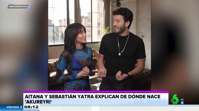 Tatiana Arús enseña en el plató de Aruser@s un vídeo en el que Aitana Ocaña y Sebastián Yatra cuentan los entresijos de su última canción juntos: 'Akureyri'. Se trata de una ciudad de Islandia, país al que viajaron juntos por el cumpleaños de la cantante. Sin embargo, la pareja reconoce que no llegaron a visitar la ciudad. "Habla de un viaje que queríamos hacer, pero que no se hizo", explica Aitana, que afirma que a Yatra le gustó tanto el nombre de la ciudad que decidió llamar así a su tema.
