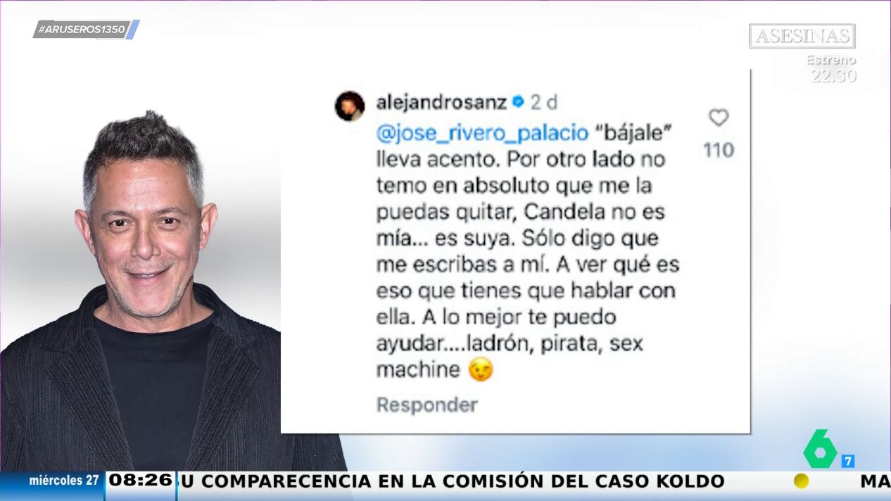 Los colaboradores de Aruser@s analizan las respuestas de la cuenta oficial de Alejandro Sanz a los hombres que comentan las fotos de su novia, Candela Peña, con frases como "escríbeme a mí".