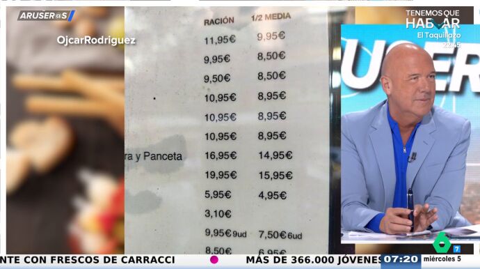 "La ración será media, pero el precio no es el 50 %", sentencia Alfonso Arús en Aruser@s tras ver la carta de este restaurante que se ha hecho viral. Además, también tiene otra observación que hacer al respecto de las medias raciones.