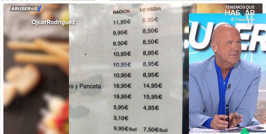 "Un plato, 11,95 euros. Media ración, 9,95 euros. Y así, con todo", resume Hans Arús en Aruser@s tras mostrar la carta de un restaurante que se ha hecho viral gracias a @OjcarRodriguez. "La ración, de media, no tiene nada. Bueno, sí, la ración, pero el precio no", sentencia el colaborador.