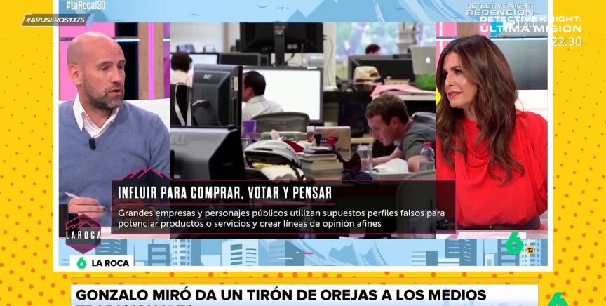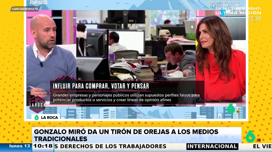 "Ya sabemos cómo están funcionando los medios tradicionales en sus páginas web, donde ponen noticias con titulares totalmente manipulados para que haya más clics y más tráfico", estalla Gonzalo Miró en La Roca, el programa de laSexta presentado por Nuria Roca. El colaborador cree que "la gran mayoría de los medios no está dando ejemplo de prácticas para cambiar este camino"; el camino del clickbait.