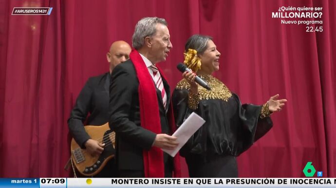 "Hay algo que tiene esta canción que todo el mundo se viene arriba y creen que lo cantan bien", destaca Alfonso Arús en el plató de Aruser@s, donde Angie Cárdenas afirma que Ortega Cano "baila mejor que canta". Además, Tatiana Arús enseña en el vídeo principal de esta noticia que el matador de toros entona un solo al final de la canción. "Perdón eh, pero es un despropósito absoluto", asegura Alfonso Arús, que queda alucinado tras escucharle: "Esta brillante actuación ha servido para despertarnos a todos con el grito tipo huracanado de Ortega Cano".