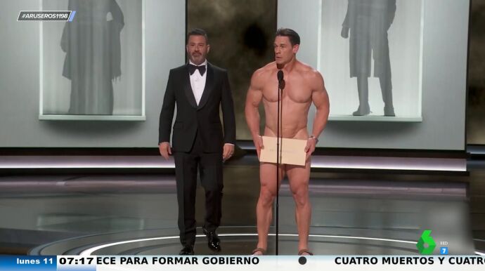 Uno de los momentos más surrealistas de la gala de los Premios Oscar 2024 ha estado protagonizado por el actor John Cena, que salió completamente desnudo a presentar el premio al Mejor Vestuario. En Aruser@s no ha hecho ninguna gracia este gag.