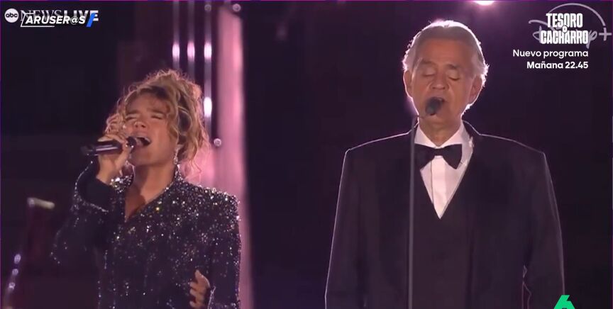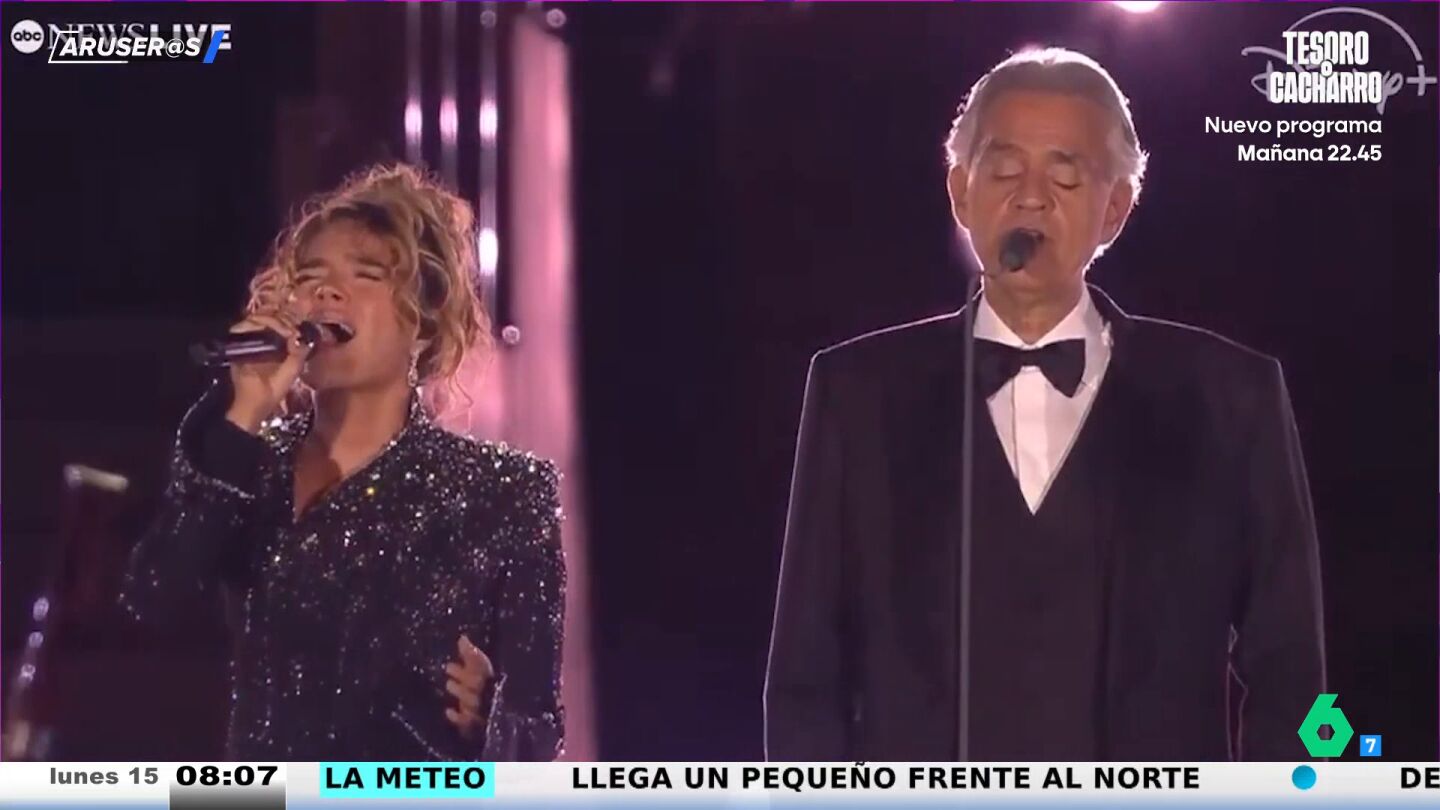 El plató de Aruser@s enmudece durante unos segundos para escuchar la preciosa versión que ambos ofrecieron a dúo de 'Vivo per lei (Vivo por ella)', todo un himno que pone los pelos de punta a Angie Cárdenas.