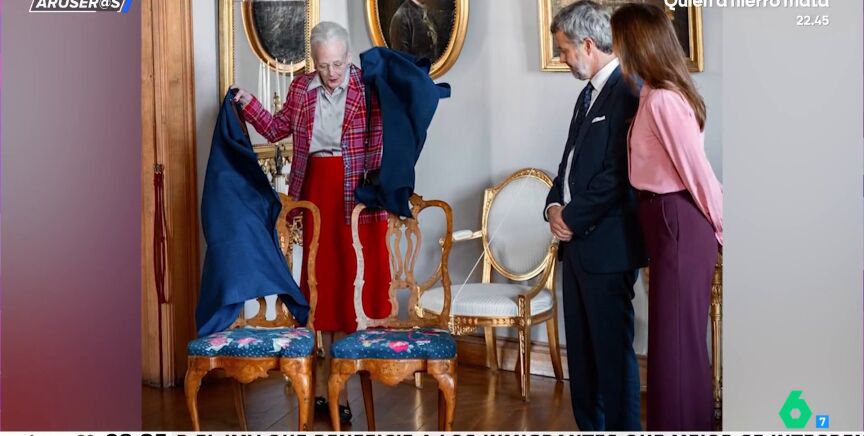 Los reyes de Dinamarca han recibido un regalo muy especial de la reina Margarita: dos sillas clásicas con la inicial de casa uno. "A saber dónde las pones", destaca Tatiana Arús en el plató, donde Angie Cárdenas directamente asegura que "es un regalo envenenado".