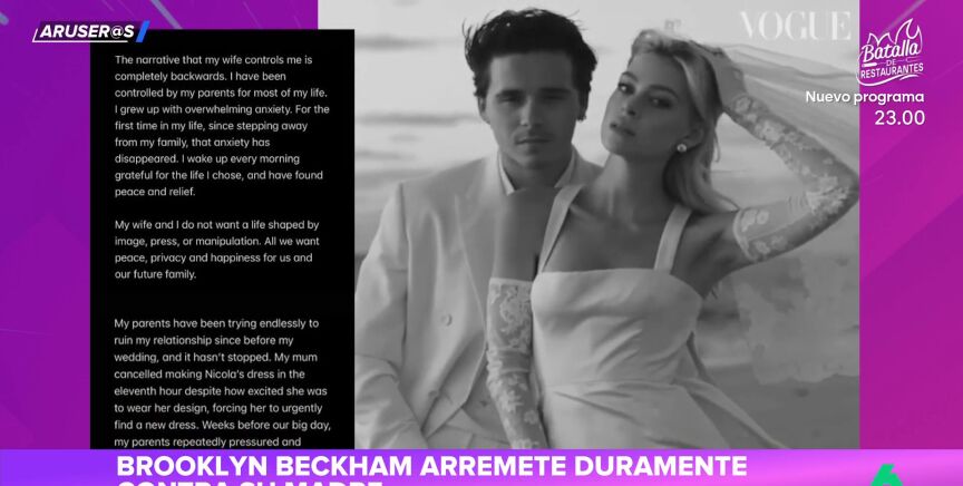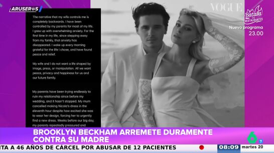 Alfonso Arús destaca que no es nadie para opinar al no estar en la familia, pero reflexiona en el plató de Aruser@s: "Hablar de su juventud como de una ansiedad abrumadora... muchos querrían estar en su lugar y tener unos papás como los Beckham". Además, Tatiana Arús recuerda que Brooklyn "es el primero que siempre intenta comercializar y vender su marca". "Es que aún está por demostrar qué puede hacer sin el apellido que le respalde", asegura, por su lado, Angie Cárdenas, que destaca: "Es muy fácil renegar, pero luego a ver qué hace".