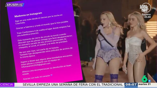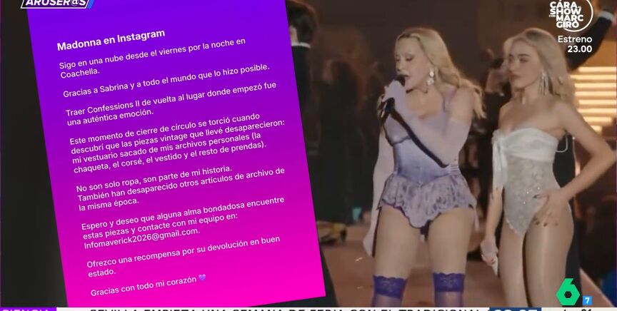 Tras la actuación en Coachella, Madonna denuncia el robo de varias piezas vintage de su vestuario vía Instagram: "No es solo ropa, es parte de mi historia. Ofrezco una recompensa por su devolución".