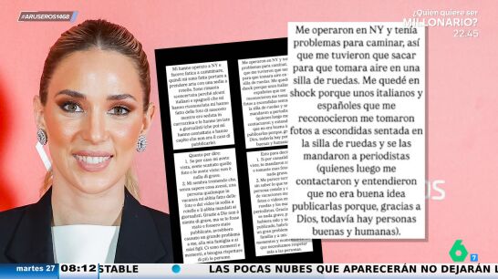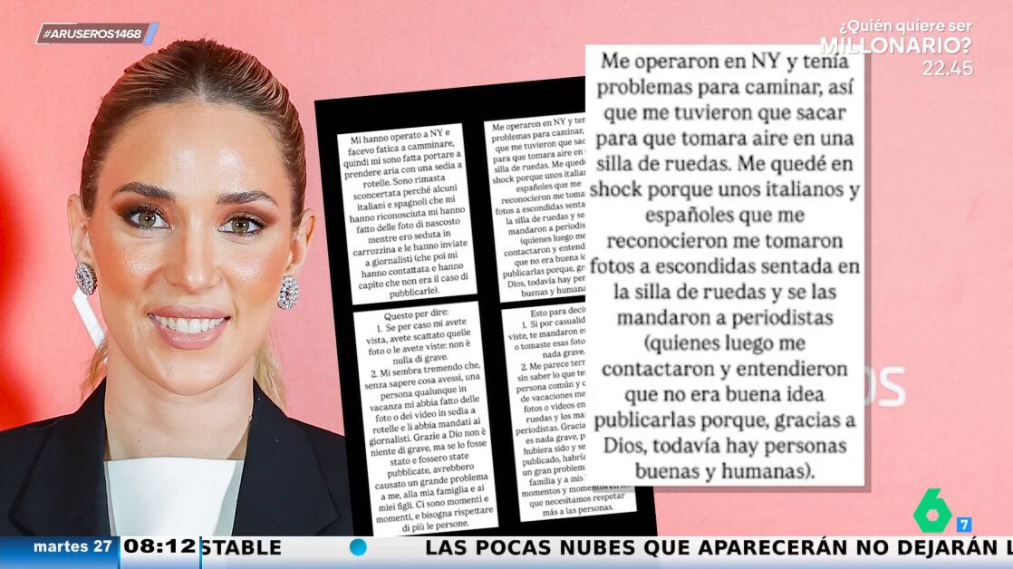 Alice Campello ha emitido este comunicado en el que explica que tuvo que usar una silla de ruedas tras ser operada en Nueva York: "Me tomaron unas fotos pero los periodistas entendieron que no era una buena idea publicarlas".