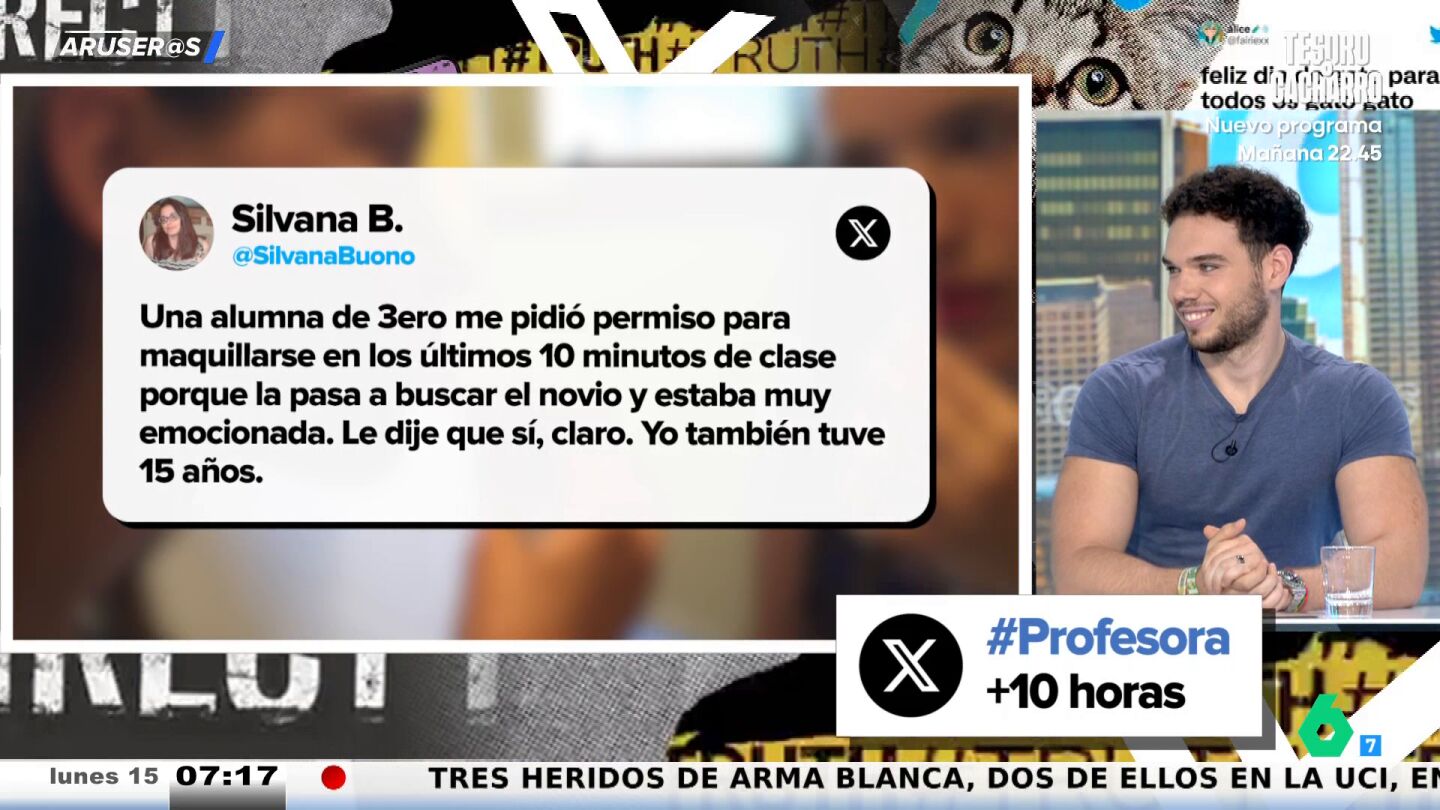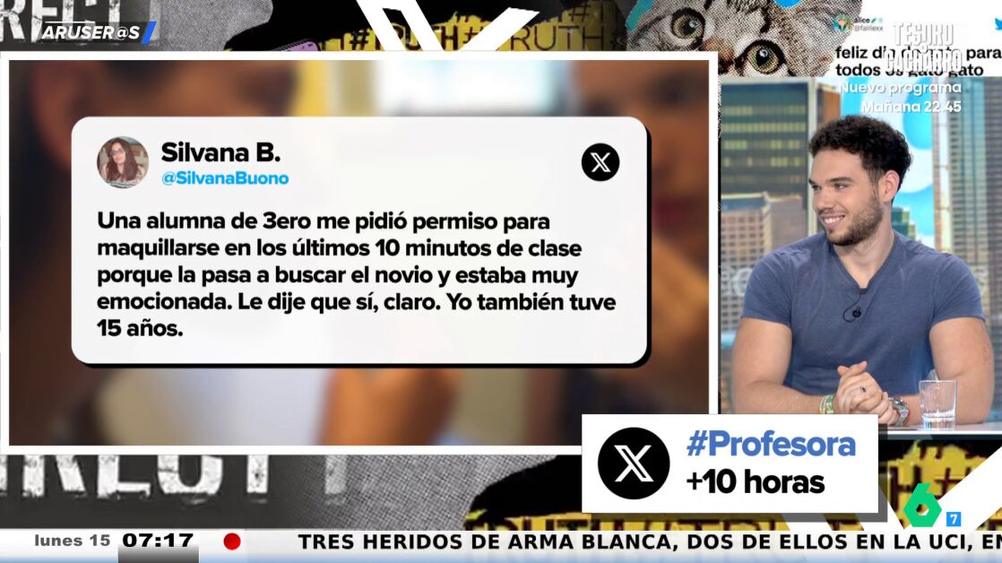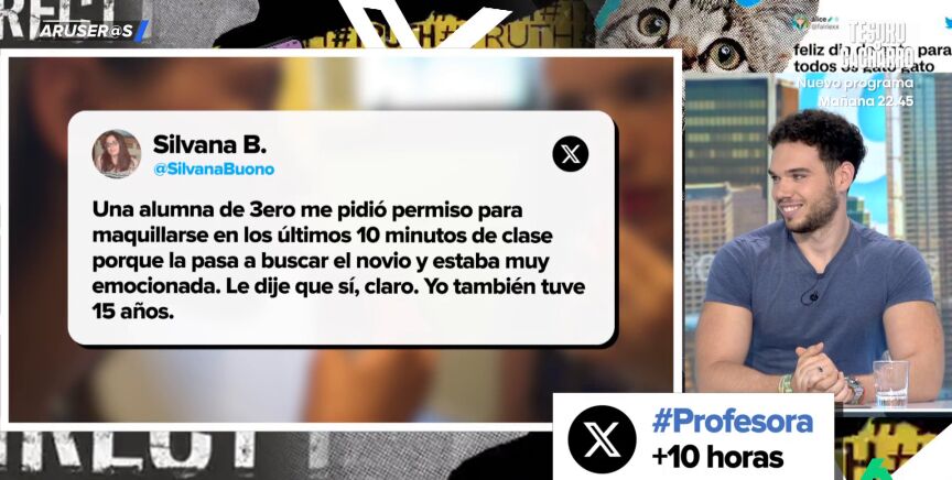 "Una alumna de tercero me pidió permiso para maquillarse en los últimos 10 minutos de clase", comienza contando una profesora en este tuit que no ha tardado en convertirse en viral y llegar al plató de Aruser@s de la mano de Hans Arús.