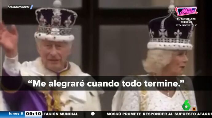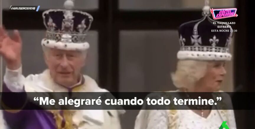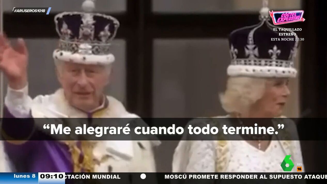 "Me alegraré cuando todo termine". Es lo que, según los expertos en leer los labios, le dijo el rey Carlos III a la reina Camila en el día de la coronación. Una "pillada" monumental que la colaboradora María Moya de Aruser@s califica de "novatada". "Tendrían que haber hecho como los futbolistas: ponerse la mano delante", apunta Sebas Maspons en la misma línea.