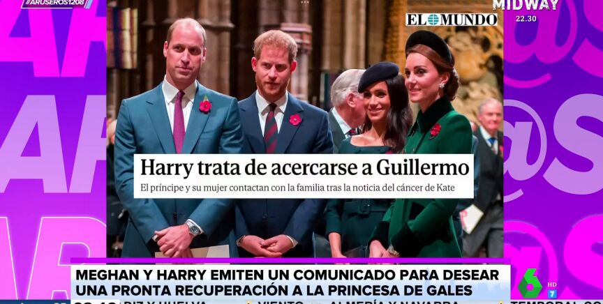 Por otro lado, los duques de Sussex, Harry y Meghan, desearon a su cuñada Kate, la princesa de Gales, que sea capaz de curarse "privadamente y en paz" del cáncer que ha anunciado. "Deseamos salud y curación para Kate y la familia, y esperamos que sean capaces de hacerlo privadamente y en paz", señaló la pareja, residente en Estados Unidos, a través de un comunicado difundido por los medios británicos.