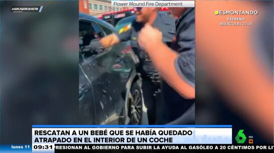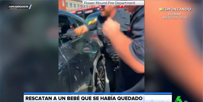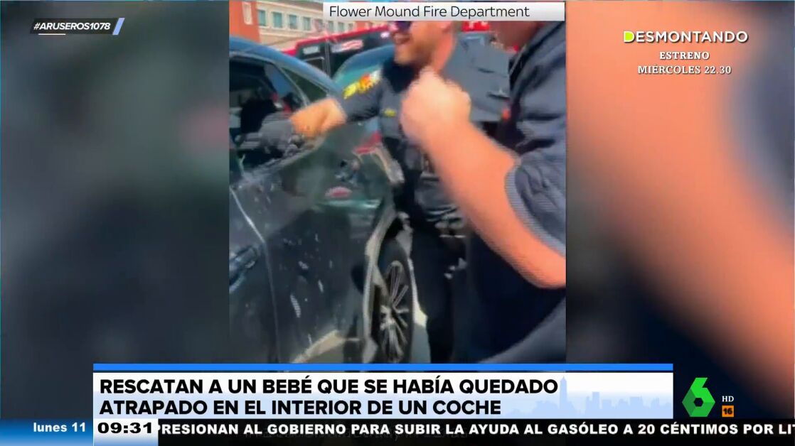 "Antes de que sea demasiado tarde, la policía consigue romper la ventanilla", adelanta Alfonso Arús para alivio de sus colaboradores y espectadores que acaban de presenciar el vídeo del momento en el que intentan rescatar a este bebé del interior de un coche. Este incidente ha sucedido en Texas y ese día, hacía mucho calor.