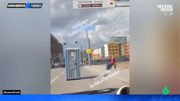 Los lavabos portátiles han dado mucho de qué hablar en el plató de Aruser@s, y el vídeo que acompaña esta noticia no ha sido para menos. En las imágenes se puede ver el momento que graba un conductor mientras está circulando por una carretera de Rusia cuando, de pronto, se le cruza con un lavabo portátilde un lado a otro de la vía.