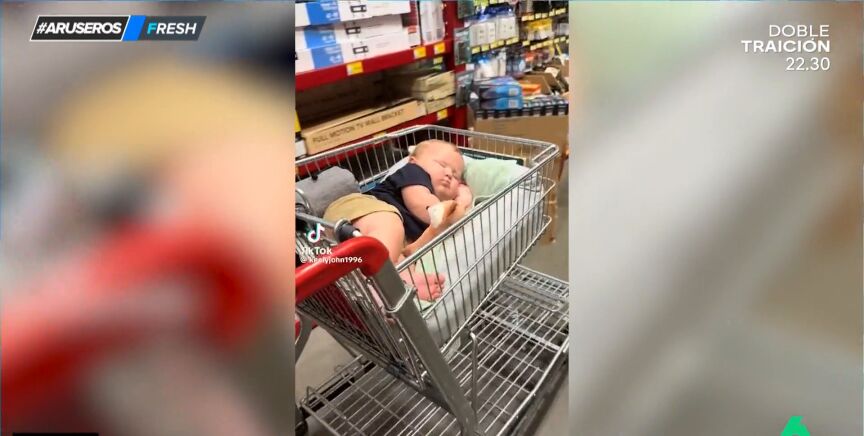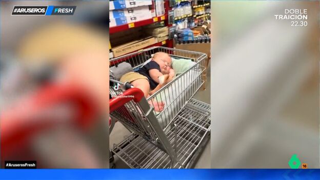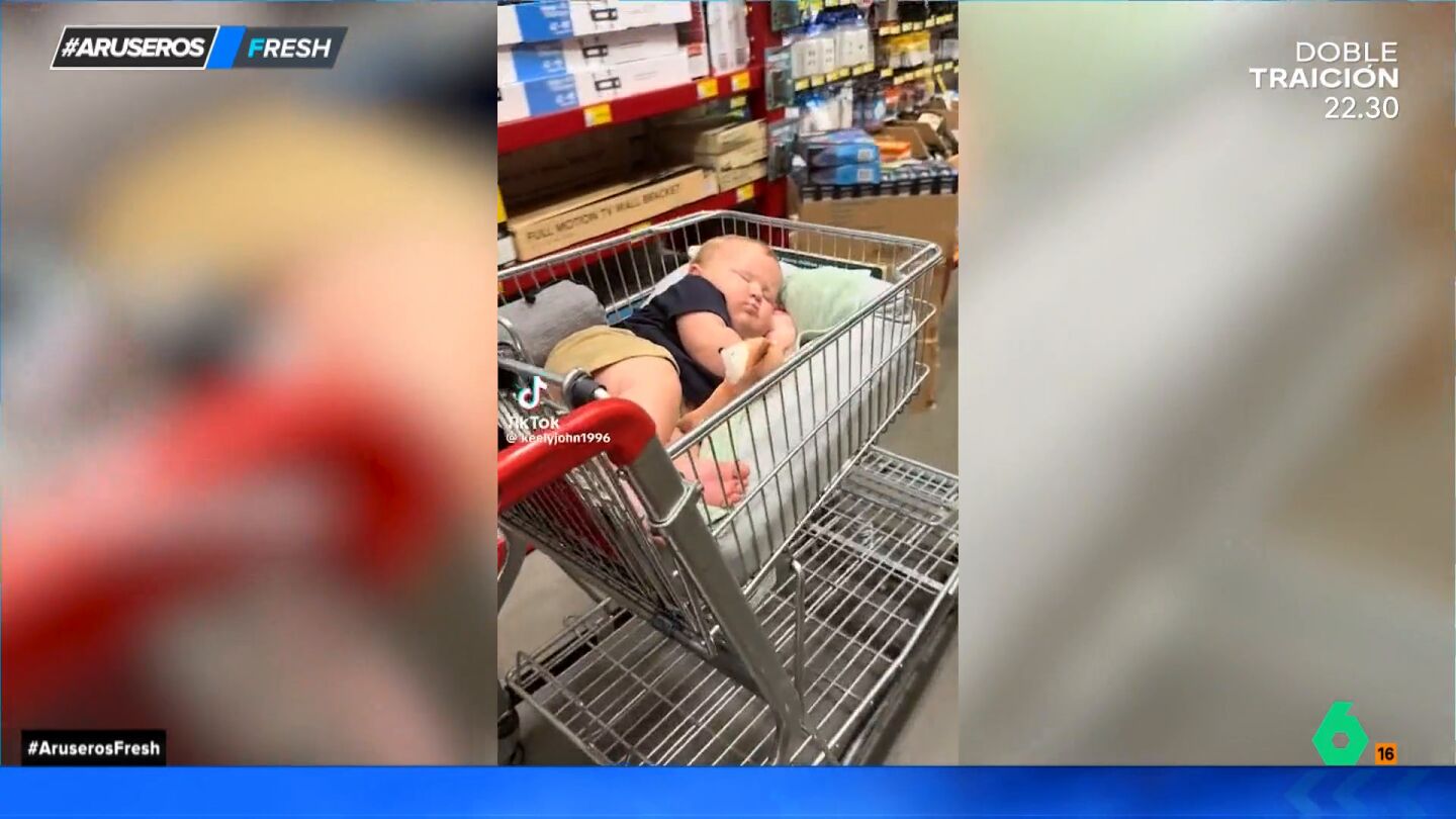 "Absolutamente adorable", comenta Alfonso Arús al ver las imágenes del pequeño dormido plácidamente en el carrito. Eso sí, llegará el momento de tener que pasar por caja y entonces, "habrá que despertarlo", asegura el presentador de Aruser@s.Sin embargo, Marc Redondo piensa que estará dormido "hasta que escuche el sonido de una bolsa de patatas".