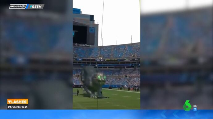 El holograma del animal incluso llega a comerse la bandera del equipo rival de los Carolina Panters en esta increíble animación generada de manera digital.