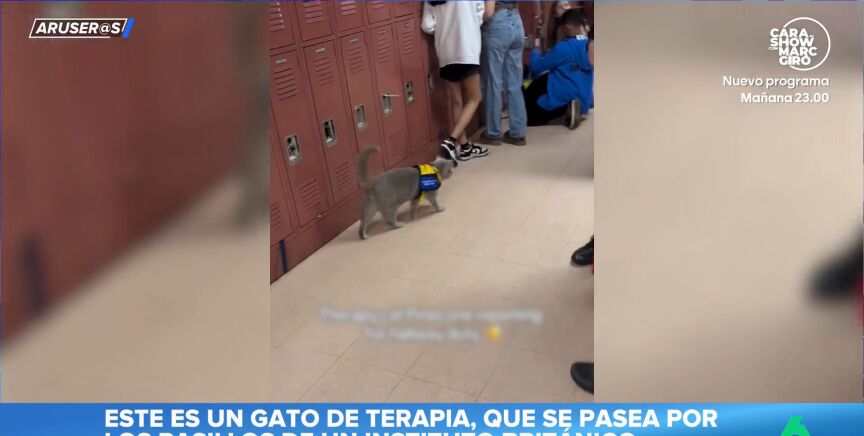 En Aruser@s muestran el caso de un gato que recorre los pasillos de un instituto británico como parte de una iniciativa innovadora. Según ha explicado la colaboradora Alba Sánchez en el plató, el felino "está perfectamente entrenado" y la "actividad está supervisada en todo momento por su cuidador", que es quien graba las imágenes.