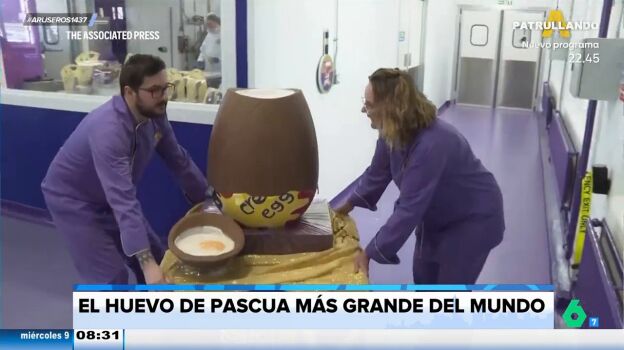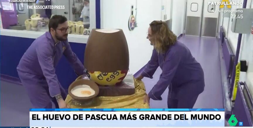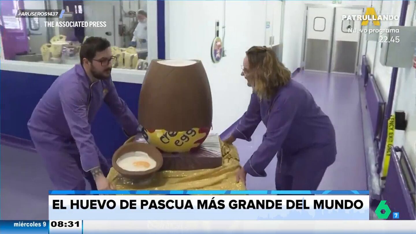 Alfonso Arús presenta una noticia que hará las delicias de los más chocolateros de Aruser@s. Un grupo de ocho reposteros de Birmingham han presentado el que ya es oficialmente el huevo de Pascua más grande del mundo. Mide 90 centímetros y pesa 45 kilos. La carcasa está hecha de chocolate y el relleno de fondant. Un proceso de elaboración que ha durado dos días y medio.