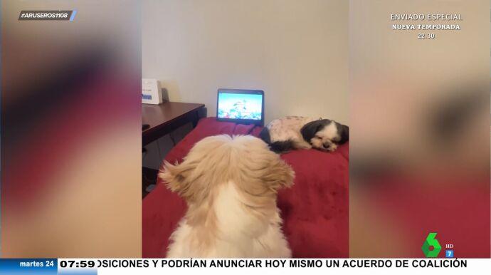 Finalmente, su dueña llega para ponerle lo que él está buscando y no arañe todo el cristal: efectivamente, es una serie de dibujos animados protagonizado por cachorritos, 'Bluey'. "Cuando la pone, se calma y se queda tranquilo mirándolos", dice Alfonso Arús algo sorprendido.