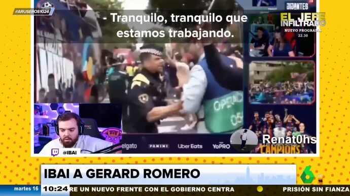 "¿Gerard Romero le levanta la mano a la autoridad?, o sea, macarrada de las grandes es esto", alucina Ibai Llanos al ver al reportero encarándose con un mosso en la rúa del Barcelona.