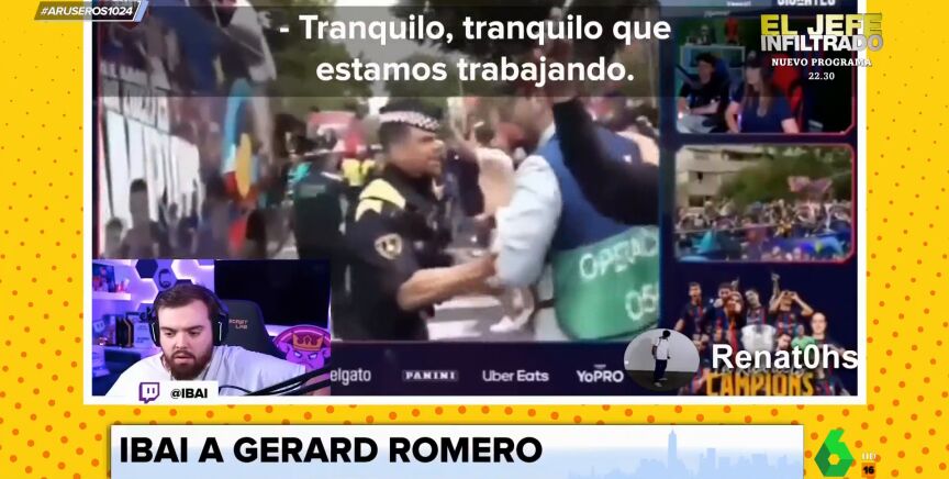 Alfonso Arús enseña en el plató del programa "el zasca de Ibai Llanos a Gerard Romero por enfrentarse a un mosso que no le dejaba cubrir la rúa del Barcelona". "Tranquilo, déjame trabajar, a mí no me toques", respondió tajante Gerard Romero al mosso que no le dejaba acercarse al autobús.