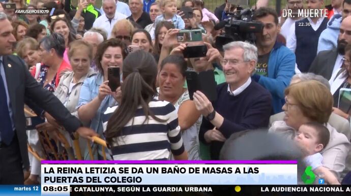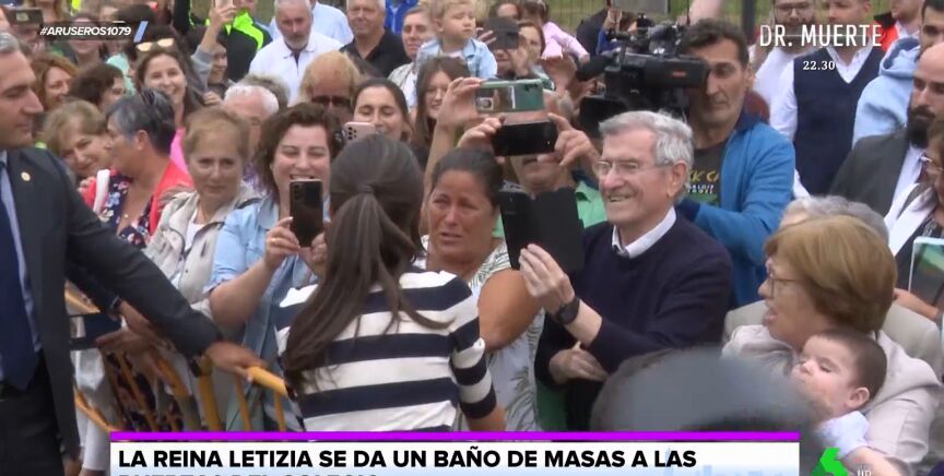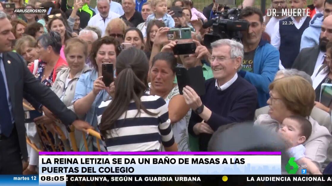 Tatiana Arús enseña en el plató de Aruser@s las imágenes de la reina Letizia en un colegio, donde ha inaugurado el curso escolar. La monarca se ha desplazado hasta Oroso, en A Coruña, para dar ánimos a los pequeños de Infantil y Primaria. Con un look informal compuesto por una camiseta de rayas, un pantalón negro y una camiseta, la reina ha saludado a los más pequeños dentro de la escuela y también ha salido para saludar a los ciudadanos que se encontraban esperándola en la calle.
