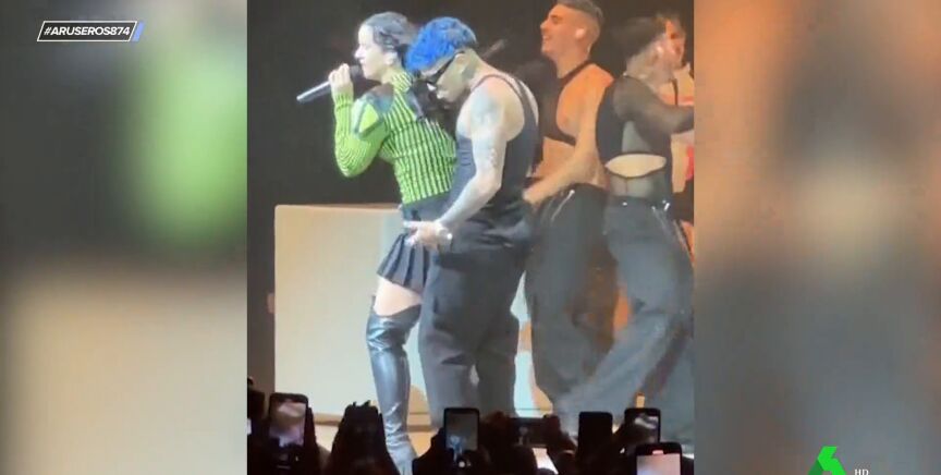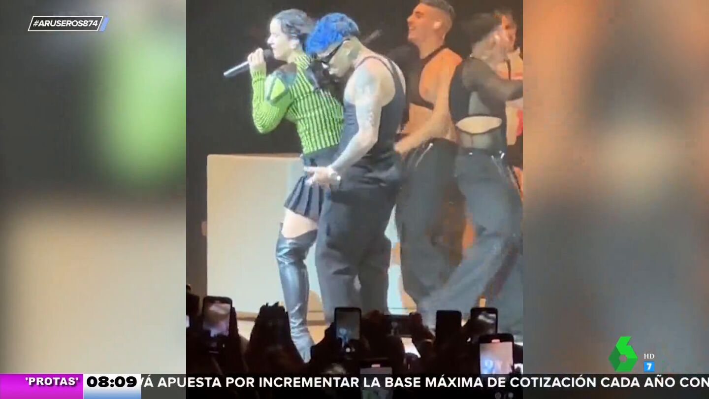 No hay manera más bonita de callar bocas que con un beso. Eso es lo que debió pensar Rauw Alejandro que decidió sorprender a Rosalía en pleno concierto. La artista se encuentra de gira con su Motomami World Tour y en su espectáculo en California su novio subió al escenario para bailar "Despechá", tal y como podemos ver en este vídeo de Aruser@s.