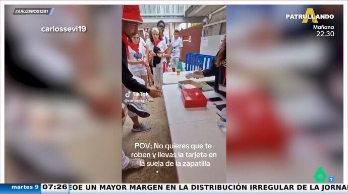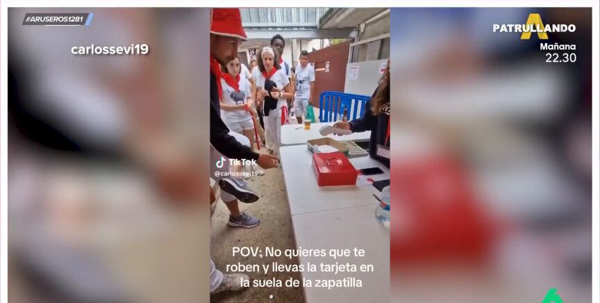 Alfonso Arús presenta en el plató de Aruser@s la última medida surrealista que ha tomado un chico en Sanfermines para evitar robos, y que se ha hecho viral en TikTok. El protagonista del vídeo que acompaña esta noticia, se dirige a pagar una entrada cuando le pide a la joven que está en la taquilla que le pase el datáfono por la suela de la zapatilla. Así es, el llamativo método del joven no es otro que llevar la tarjeta de crédito en la suela del zapato.