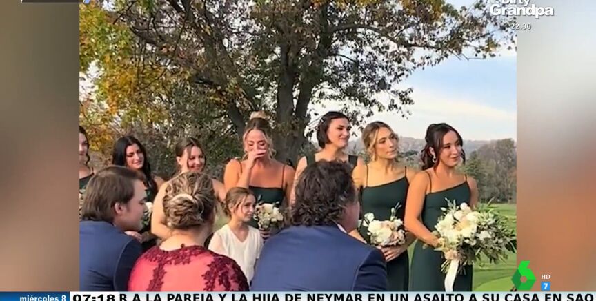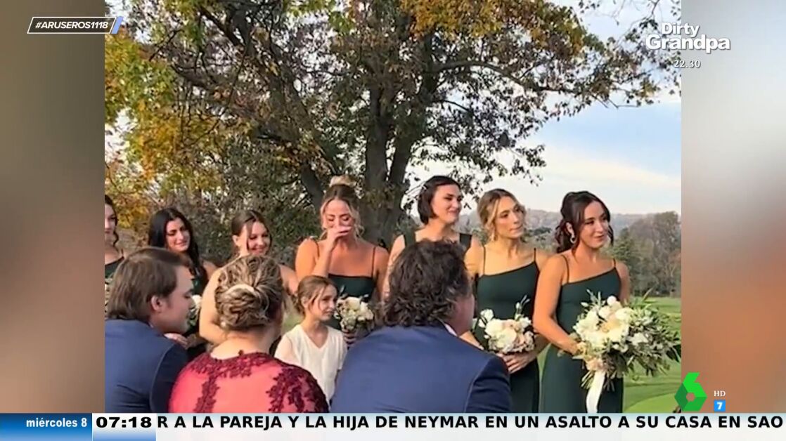 "Cuando el novio dice 'voy a ser feliz a tu lado para toda la vida', la hermana de la novia se está desternillando de risa como diciendo, 'pero vaya tontería acabas de decir, bro'". Así describe Alfonso Arús este divertido vídeo viral, emitido en Aruser@s, en el que podemos ver a la dama de honor más importante de la boda esconderse para ocultar las carcajadas que se le escapan en el momento más inoportuno.