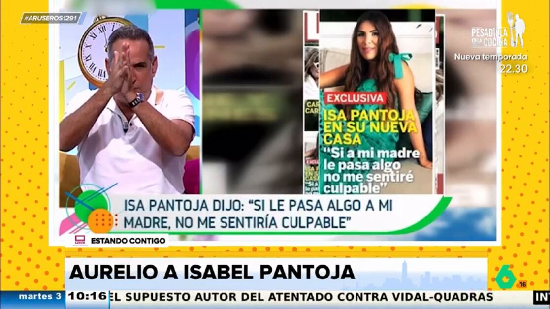 En el plató de Aruser@s, además de reírse con las ocurrencias de Aurelio, analizan la situación. "Yo no conozco ni a la hija ni a la madre en persona, pero sí sé que la persona con más 'examigos' del mundo es Isabel Pantoja: Parada, Chelo...", comenta Andrés Guerra.