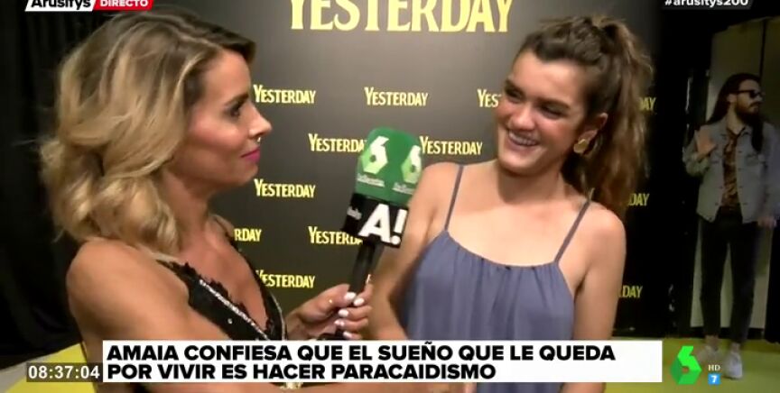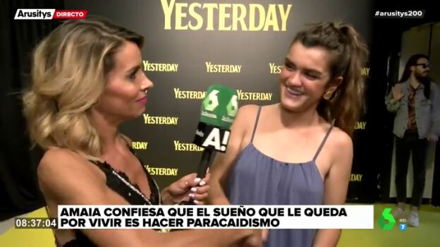 Bea Jarrín habla con Amaia Romero en el preestreno de la película sobre The Beatles, 'Yesterday'. La cantante confiesa en Arusitysque su sueño por cumplir es tirarse en paracaídas, por lo que la reportera le propone tirarse juntas.