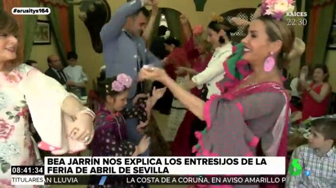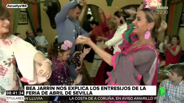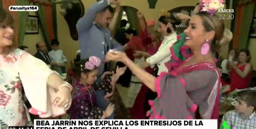 Además, Bea Jarrín pide la grupo que le cante al programa una tema personalizado. "En la Feria de Abril mi madre me despierta, me pone Arusitys, que lo echan en laSexta", canta el grupo.