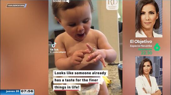 La bebé se queda un buen rato con él, pero cuando se cansa se lo entrega de nuevo a su madre para que no lo pierda. "Ella sabe que es algo supervalioso con la edad que tiene", comenta sorprendida Angie Cárdenas tras ver como se lo entrega a su madre, mientras que Hans Arús en tono jocoso apunta que "estamos ante la nueva Georgina".