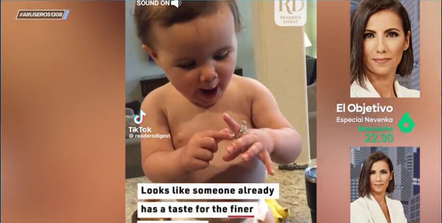 "Los bebés lo tienen muy claro, un diamante es para siempre", anuncia Alfonso Arús para introducir el vídeo principal de esta noticia. En la imágenes se puede ver a una niña a la que su madre le pone un anillo con un diamante. Al verlo, la niña se queda boquiabierta, alucinando con su brillo.
