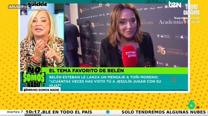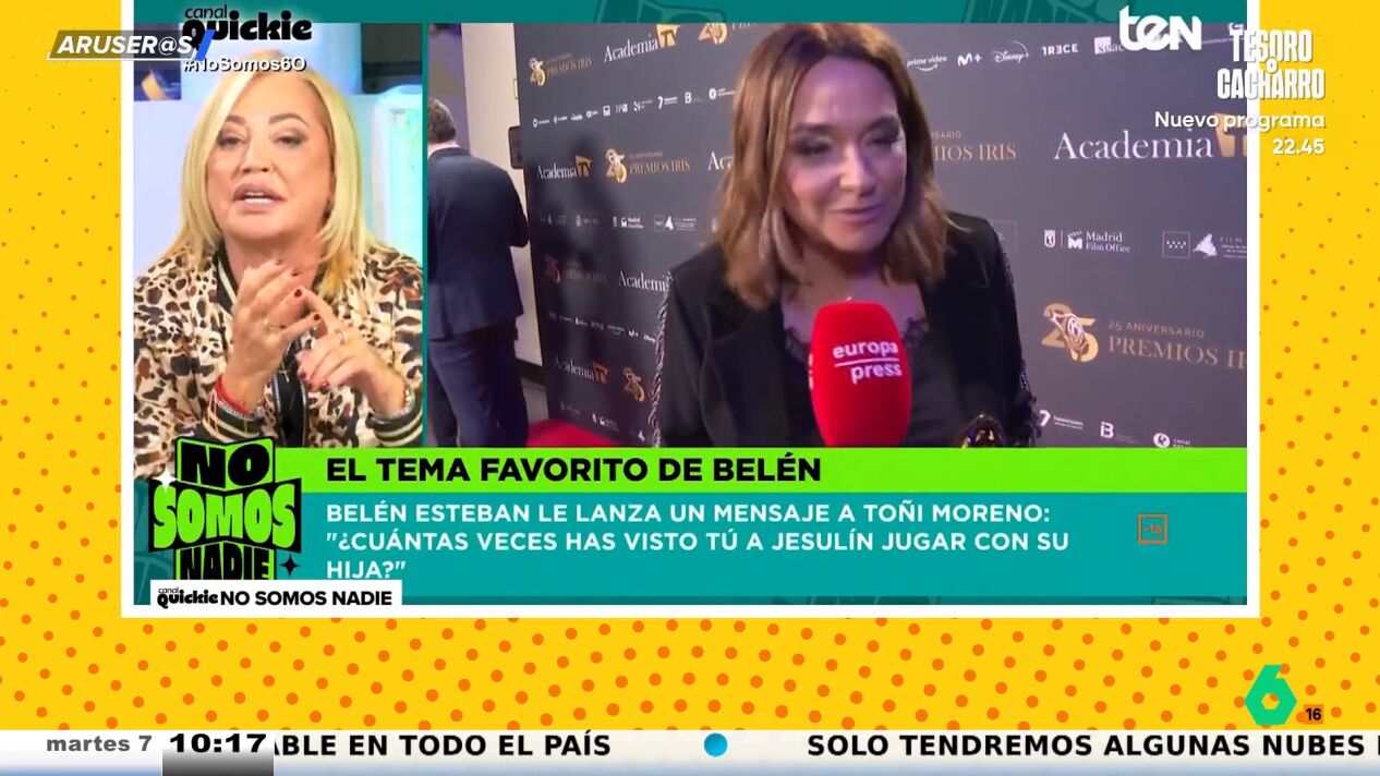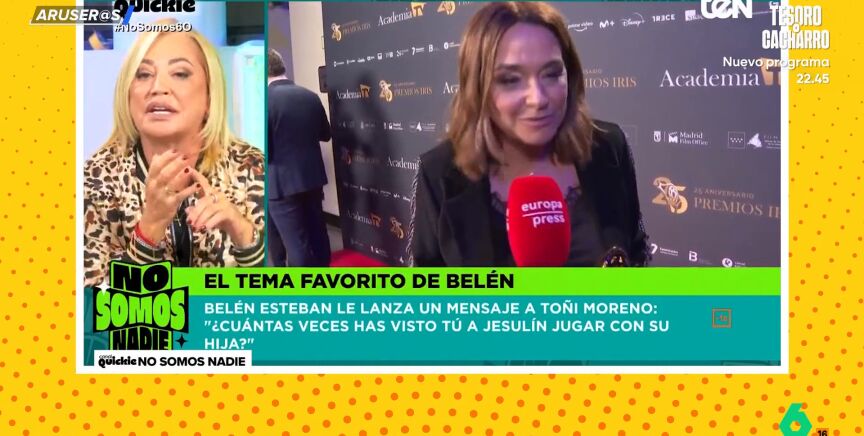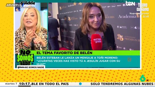 "Mira, Toñi Moreno, que te tengo un cariño enorme, pero te voy a decir una cosa, ¿cuántas veces has visto tú jugar a Jesulín con su hija?", pregunta indignada Belén Esteban, que manda un rotundo mensaje: "Me van a matar, pero ya no puedo con este lavado de imagen".