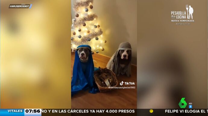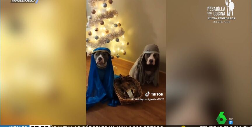 En el portalito que vemos en este vídeo de Aruser@s comprobamos como "la creatividad de esta familia no tiene límites", reconoce Alfonso Arús. Los perros están disfrazados de San José, la Virgen María y el Niño Jesús. "Les ha quedado muy bien porque los tres están en pose y muy metidos en su papel", analiza el presentador del programa.
