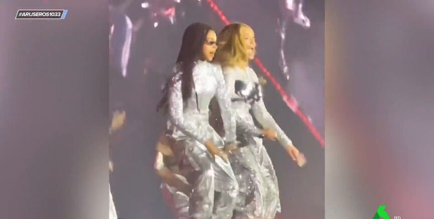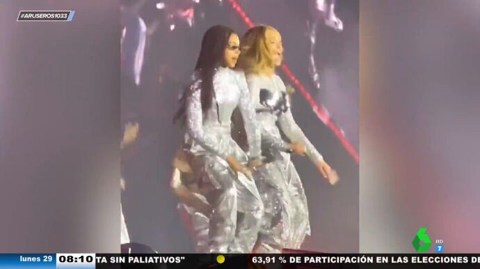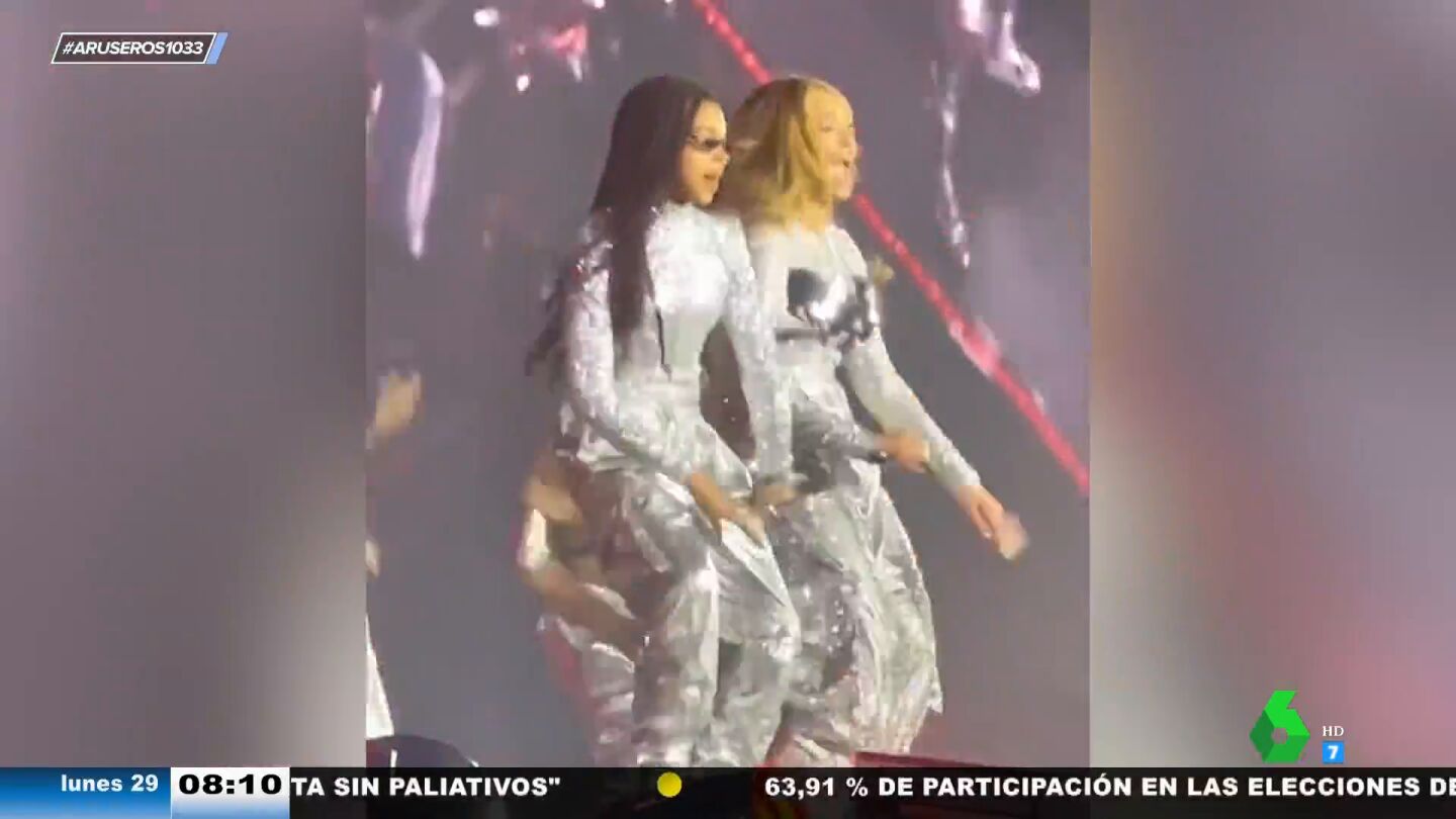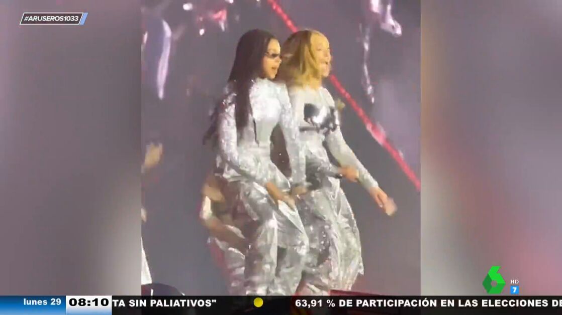 Tatiana Arús enseña en el plató de Aruser@s el momentazo de Beyoncé en su último concierto en París. Y es que la artista sorprendió al público al subir al escenario a su hija, Blue Ivy, de tan solo 11 años. "La pequeña apunta maneras porque, realmente, es la digna sucesora de su madre", destaca Tatiana Arús, que afirma que "no le tembló el pulso a la hora de bailar con su madre" ante 80.000 personas.