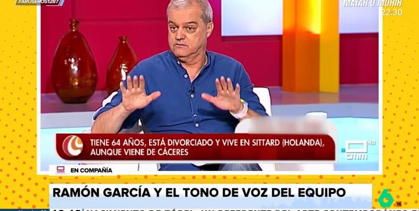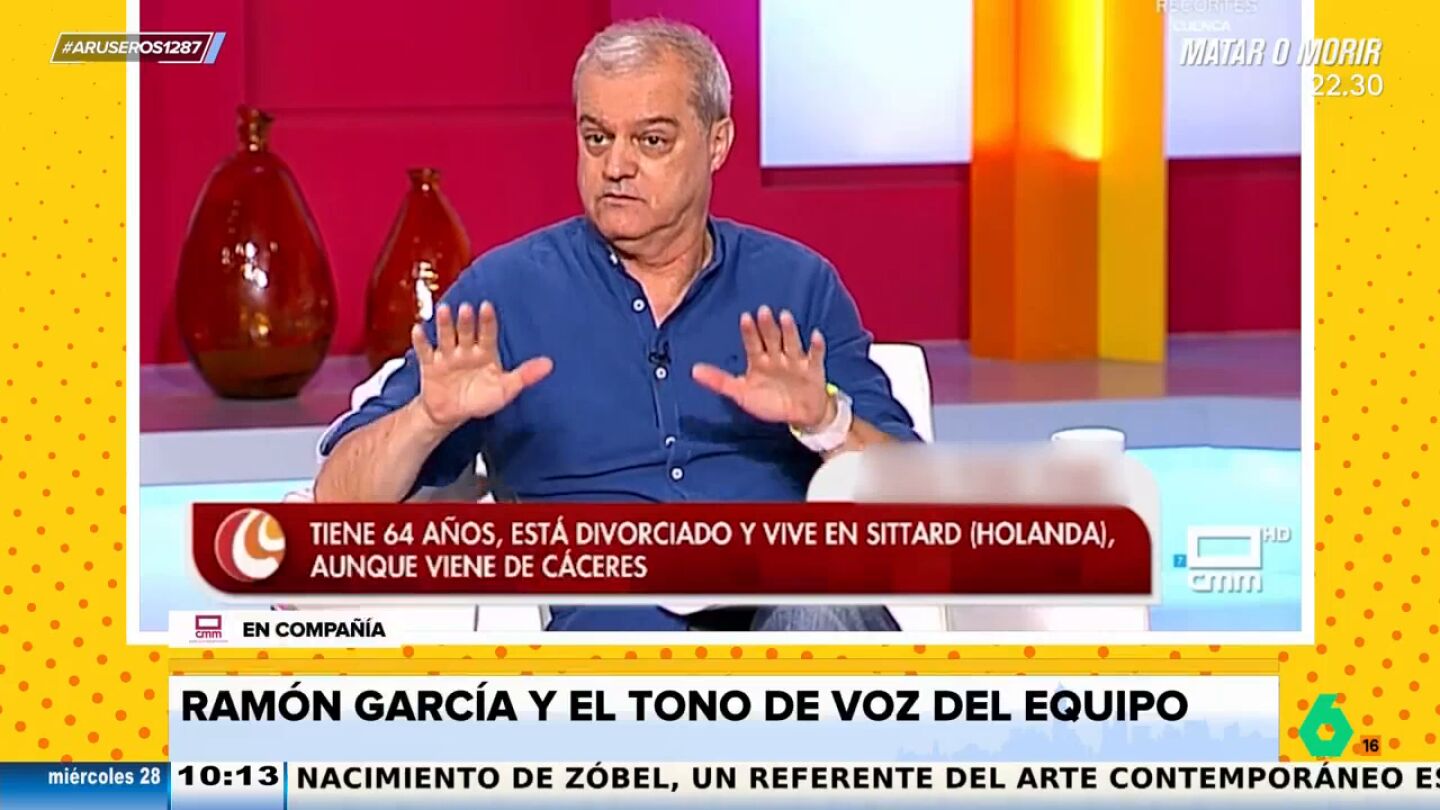 "Chicos, ¿podemos hablar todos un poquito más bajito?", anuncia Ramón García a su equipo en directo en su programa de 'En compañía' de Castilla-La Mancha TV. Al presentador parece que le molesta el tono elevado de sus compañeros. "Ya sé que tenéis que dar órdenes, pero bajito, por favor", advierte, tal y como podemos ver en este vídeo emitido en Aruser@s.