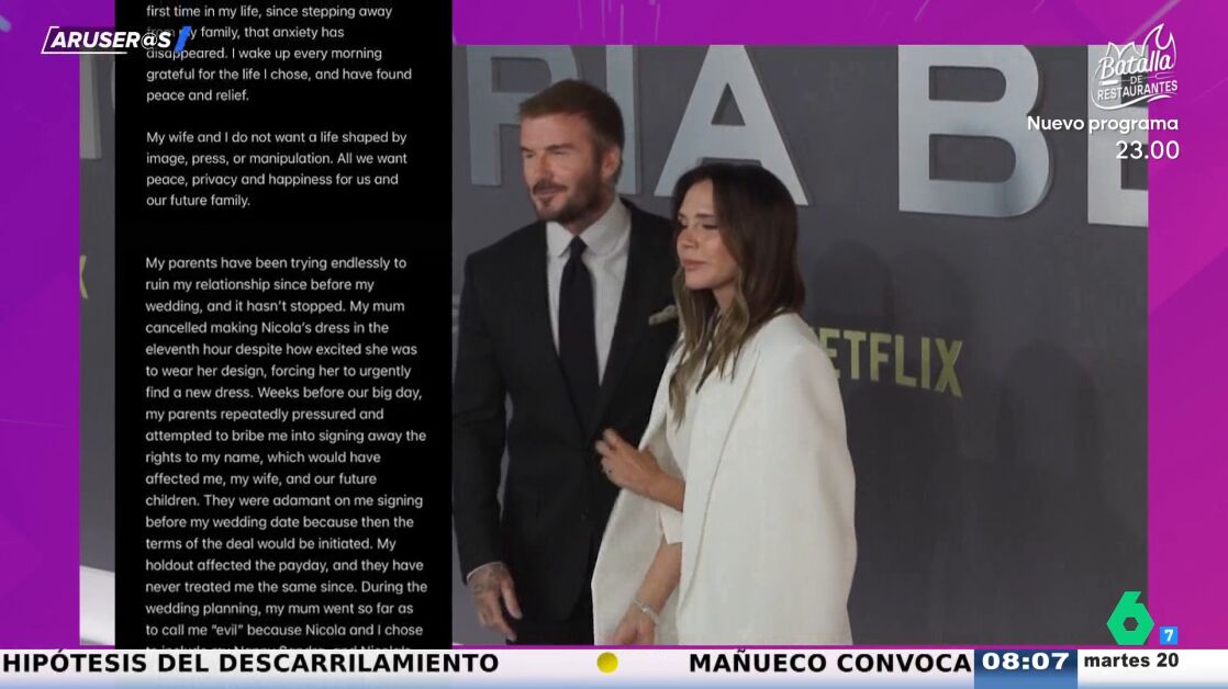 "Desafortunadamente, mis padres y su equipo han seguido acudiendo a la prensa, dejándome sin otra opción que hablar por mí mismo y decir la verdad sobre solo algunas de las mentiras que se han impreso", ha escrito el mayor de los Beckham, que ha asegurado que no quiere reconciliarse con su familia: "No me dejan controlar, me estoy defendiendo por primera vez en mi vida".