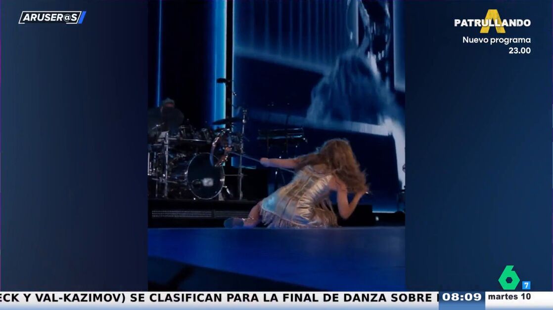 Shakira ha compartido a través de sus cuentas en redes sociales la caída que ha sufrido sobre el escenario durante su último concierto en El Salvador. "Ha querido tirar un poco de humor compartiendo ella misma las imágenes", explica Tatiana Arús en el plató, donde enseña en el momento en el vídeo principal de esta noticia.