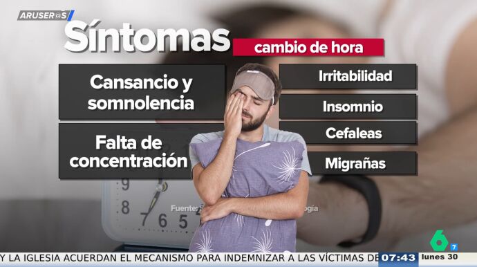 Entre los síntomas más comunes destacan: cansancio y somnolencia, falta de concentración, irritabilidad, insomnio, cefaleas y migrañas. "Si dormimos menos, nos afecta al apetito, a la productividad y a la eficiencia... y con este cambio de horario de verano, los expertos señalan que puede costarnos más adaptarnos que en el cambio de otoño porque se pierde esa hora de sueño", explica la periodista Elizabeth López.