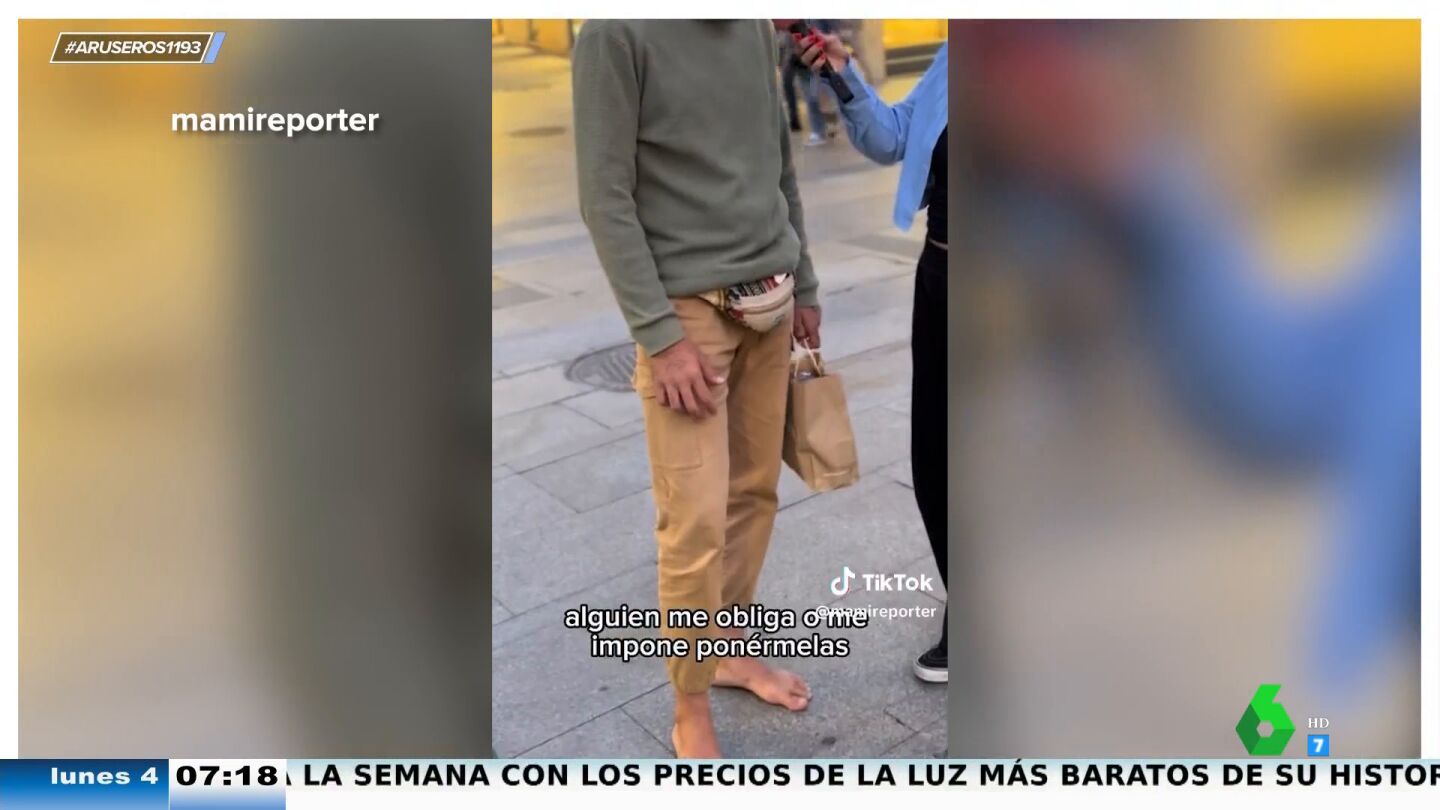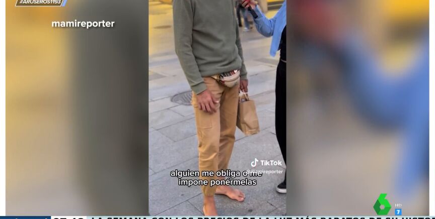 El vídeo viral de la tiktoker @mamireporter muestra a un chico que explica que siempre va descalzo "porque es bueno para el cuerpo tomar su posición natural y no tener nada de plástico debajo del pie y también a nivel energético es muy potente". La reportera no puede evitar preguntarle si no tiene algunas zapatillas por si acaso y él responde que sí. "Llevo unas sandalias a veces por si alguien me impone o obliga a ponérmelas", sigue contando.
