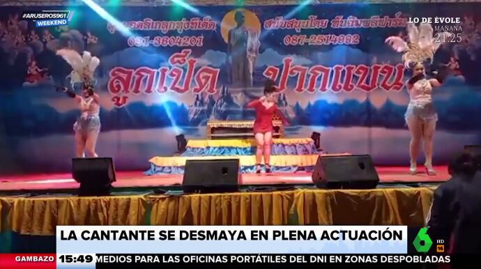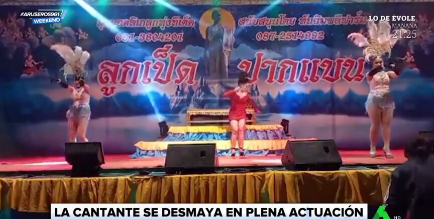 Durante un espectáculo en Tailandia, la cantante empieza a encontrarse mal y acaba cayendo desmayada en medio del escenario, como se puede ver en el vídeo de Aruser@s Weekend que acompaña a esta noticia. A pesar de la situación, las bailarinas que actúan con ella, siguen danzando como si no hubiera pasado nada. Alfonso Arús se preguntaba si seguían bailando por su gran profesionalidad o porque no les importaba un pimiento lo que le había pasado a su compañera. Es sorprendente que, cuando se llevan a la mujer, las dos bailarinas siguen confundidas y siguen sin saber qué hacer.