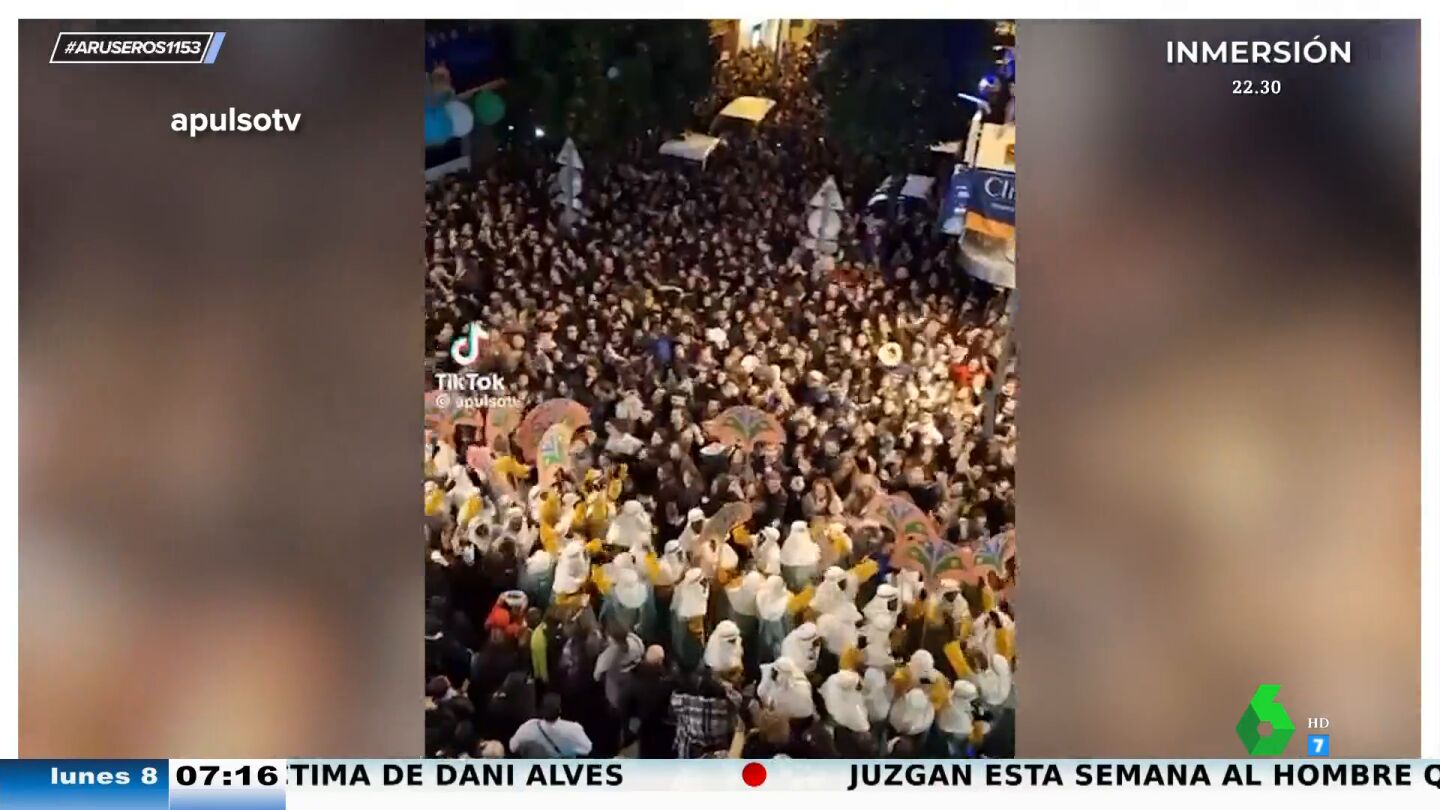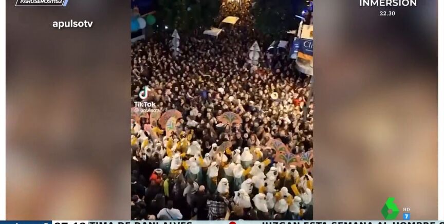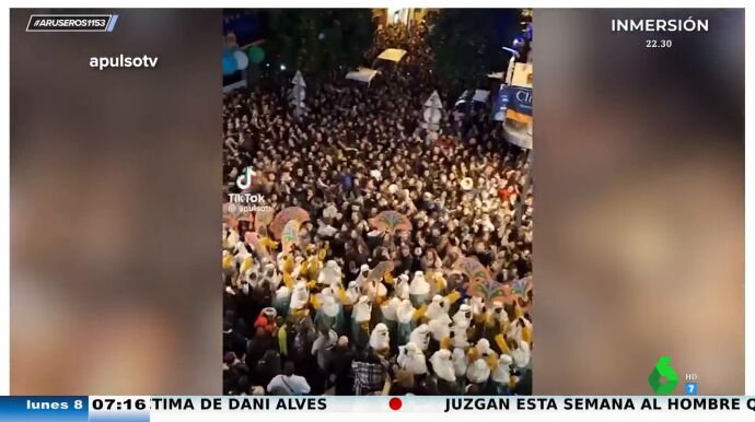 Los asistentes, quienes desfilaban disfrazados, los pajes reales y hasta los Reyes Magos se pusieron a cantar. "No sé qué tiene que ver con la Cabalga", se pregunta Alfonso Arús en plató. "¿Y qué tiene que ver Bob Esponja?", contraataca Angie Cárdenas.