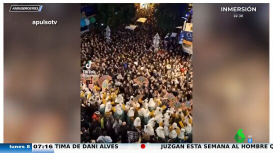 La orquesta comenzó a tocar los primeros acordes de la BZRP Music Sessions #52 y para el momento del estribillo, la locura ya se había desatado por las calles de Sevilla. "Quédate, que la noche sin ti duele", entonaban miles de personas, como podemos ver en este vídeo subido por @apulsotv a TikTok y emitido en Aruser@s.