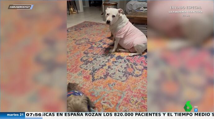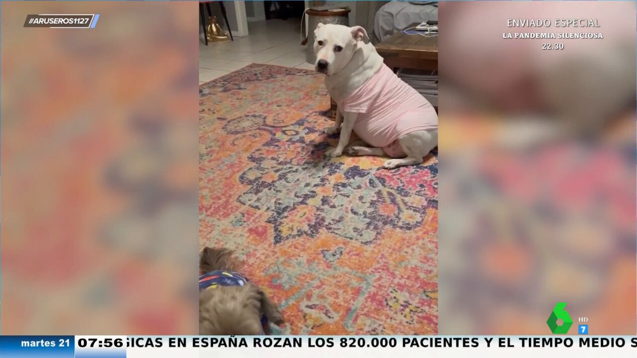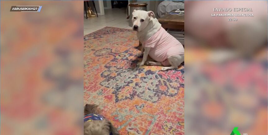 "Les compran los pijamas a los perros, pero no les quedaban la talla de perro grande y alguno sufre un poco", destaca Alfonso Arús, al enseñar este vídeo viral en el que se puede ver cómo mientras un perro pequeño camina contento con su pijama, a su lado un perro más grande pone cara de circunstancias con su pijama, varias tallas más pequeño. "Esto es antes del turrón, imagínate después, pobrecito", destaca Angie Cárdenas.