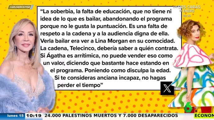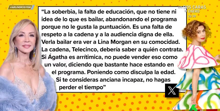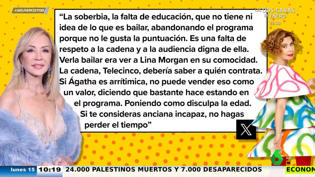"Verla bailar era ver a Lina Morgan", insiste Lomana, que afirma que "la cadena Telecinco debería de saber a quién contrata": "Si Ágatha es arrítmica, no puede vender eso como un valor, diciendo que bastante hace con estar en el programa". "Poniendo como disculpa la edad. Si te consideras anciana incapaz no hagas perder el tiempo", concluye tajante Carmen Lomana sobre la diseñadora.