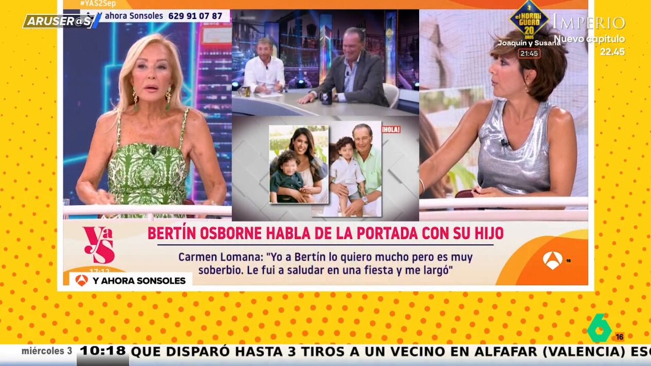 Carmen Lomana está consternada. Bertín Osborne está molesto con ella y así se lo ha hecho ver en público. "Yo lo quiero mucho, pero es muy soberbio. Y yo no pensé que se había enfadado conmigo por eso", comenta en este fragmento de 'Y ahora Sonsoles' que recoge Aruser@s.