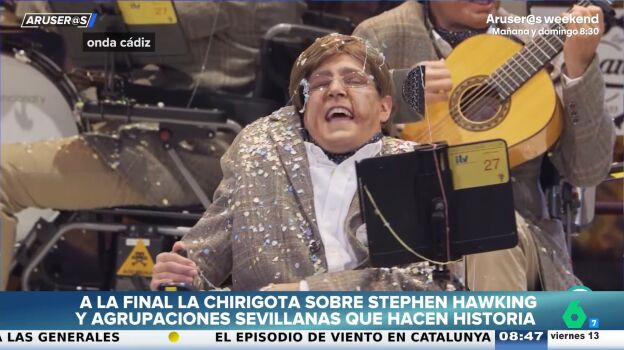 Los tertulianos han destacado la chirigota de los "Stephen Hawking en silla de ruedas" como una de sus favoritas. "Llévame esta noche a San Fernando, un ratito a pie y otro...¡Tampoco hay nada que ver en San Fernando!", cantan los protagonistas, subidos sobre el escenario en sus sillas de ruedas. "¡Y no se les mueve ni el flequillo!", ríe la periodista Elizabeth López, dejando claro que la imitación es lo último que se pierde, incluso en plena sátira.