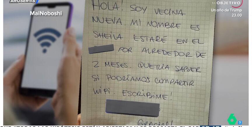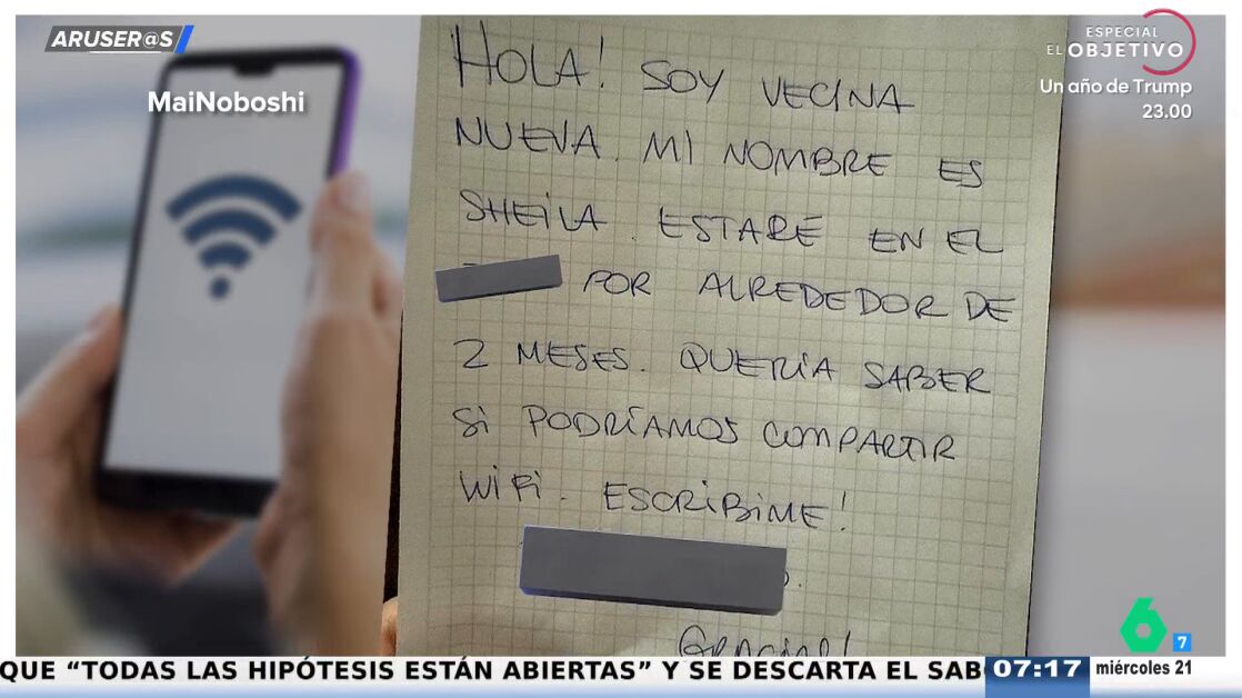 Se trata de una mujer recién mudada a una nueva urbanización, aunque solo por un corto periodo de tiempo: apenas tres meses. Debido a su breve estancia, ha colgado el siguiente cartel dirigido a sus vecinos: "Soy vecina nueva y estaré por aquí alrededor de dos meses. Quería saber si podríamos compartir wifi. Escribidme".