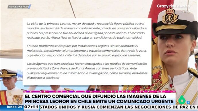La Casa Real confirmó que iba a denunciar ante la Policía de Chile la difusión de unas fotografías de la princesa Leonor en una actividad privada en un centro comercial de Punta Arenas. Según han indicado desde el Palacio de la Zarzuela, algunos responsables del control de las cámaras de seguridad facilitaron el acceso a las imágenes a un medio de comunicación del país. Esto, según cuentan, supondría "una infracción de la normativa vigente" en materia de protección de datos, tanto en Chile como en España.